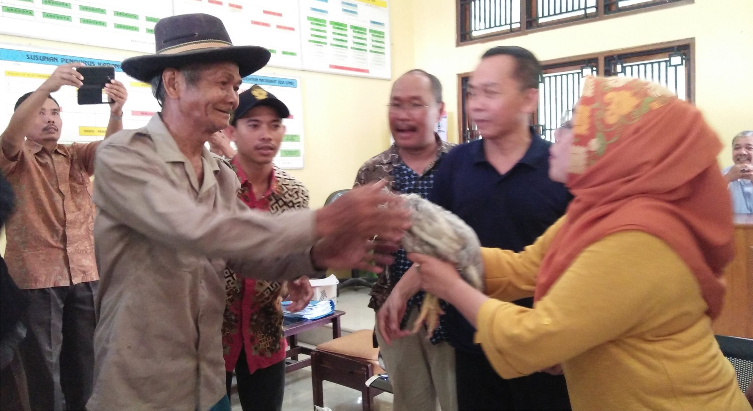 SUARA CIREBON – Kementrian Pertanian (Kementan) Republik Indonesia melalui Kepala Pusat (Kapus) Penyuluhan Pertanian Dr Ir Siti Munifah memberi bantuan 50 ekor ayam buras (bukan ras) untuk 208 warga Palimanan Barat (Palbar), Kecamatan Gempol, Kabupaten Cirebon yang masuk dalam kategori rumah tangga miskin (RTM), Sabtu (17/11/2018) di kantor desa setempat. Didampingi Kepala Dinas Ketahanan Pangan Kabupaten Cirebon, Muhiddin, Kapus menyerahkan bantuan ayam secara simbolis kepada warga RTM desa setempat, Suki.