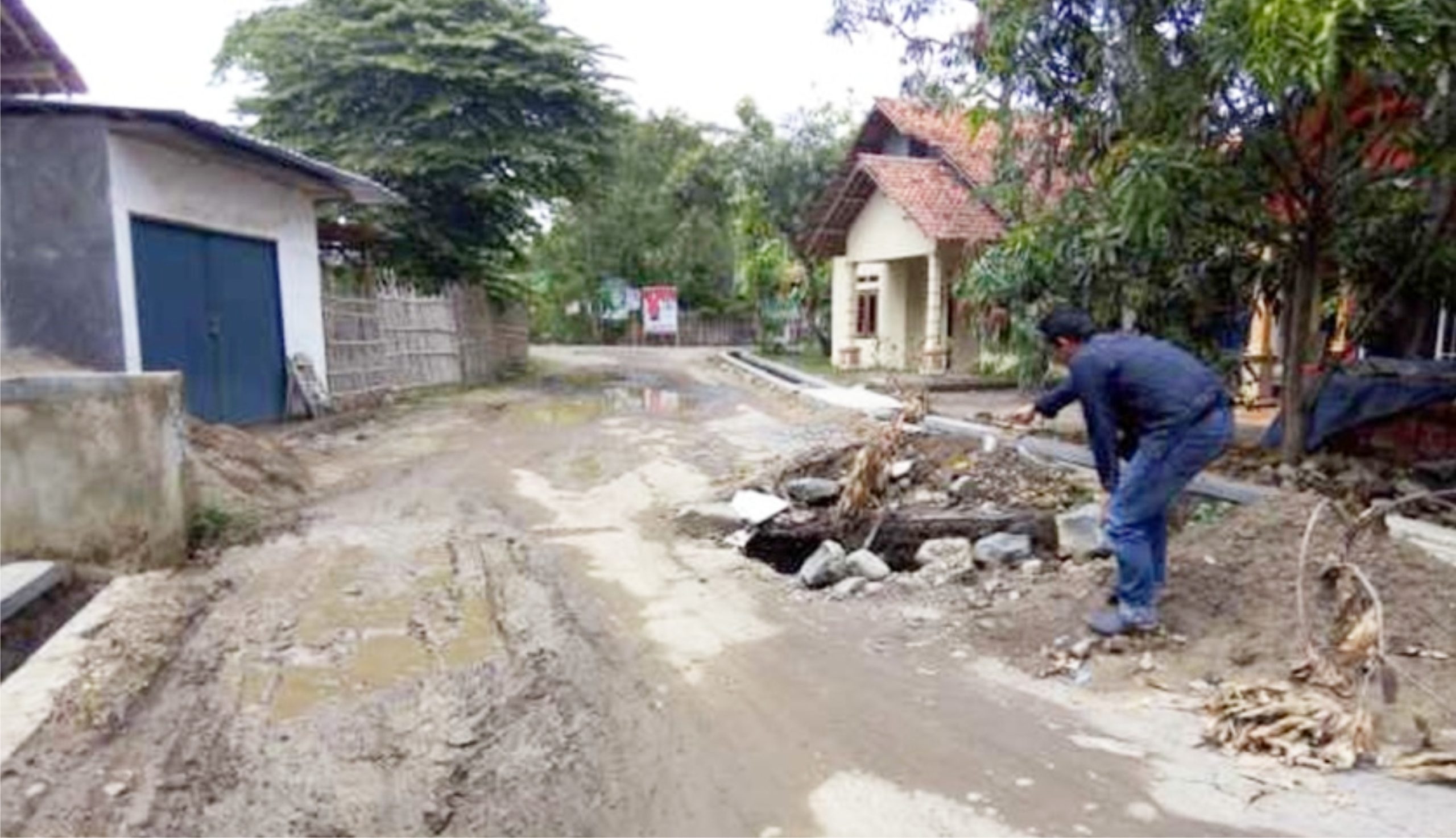 Jalan yang diperbaiki ditinggal begitu saja oleh pemborongnya. Tidak ada yang tahu pasti mengapa pekerjaan tersebut tidak dituntaskan.