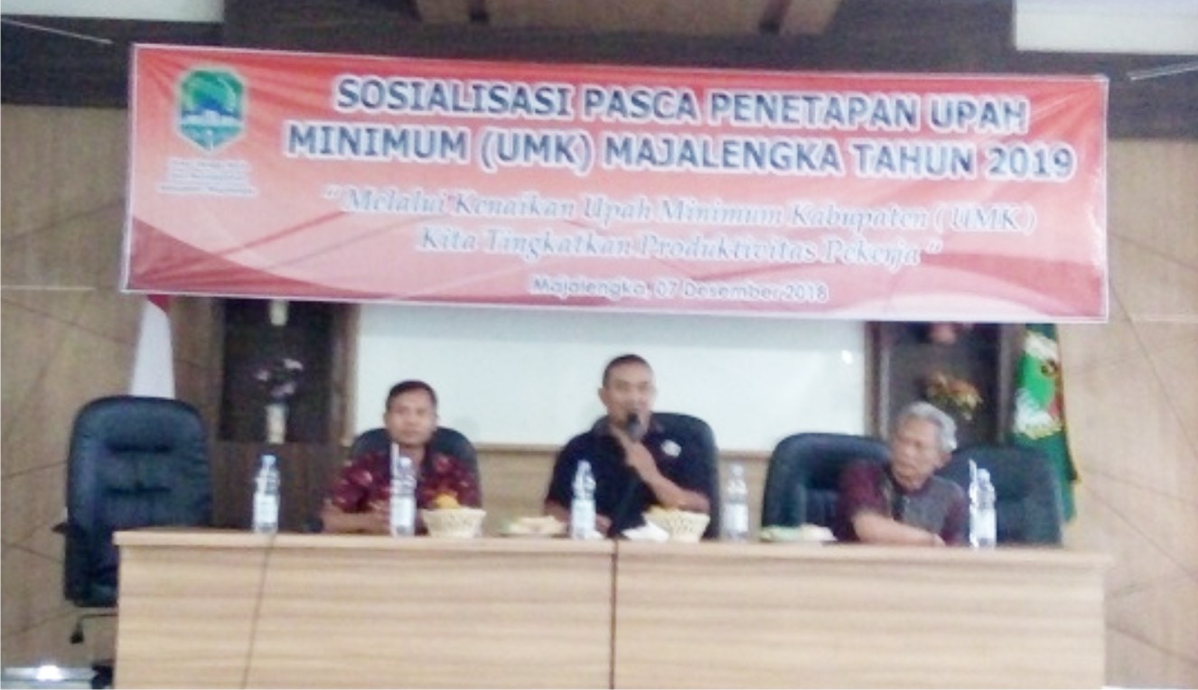 Hal ini terungkap saat sosialisasi pasca penetapan UMK 2019 yang diselenggarakan olehDinas Tenaga Kerja dan Perindustrian (Disnakerin) Kabupaten Majalengka, Jumat, (7/12/2018). Nampak hadir Kepala Dinas Tenaga Kerja dan Perindustrian Kabupaten Majalengka H. Ahmad Suswanto, S.Pd. M.Pd. perwakilan perusahaan perusahaan yang ada di Kabupaten Majalengka, perwakilan serikat pekerja Kabupaten Majalengka dan pemateri kegiatan selain dari Disnakerin Kabupaten Majalengka nampak hadir H. Dadang Sudiono M.Si. dari Dosen Universitas Majalengka dengan tema kegiatan melalui kenaikan UMK kita tingkatkan produktivitas pekerja.