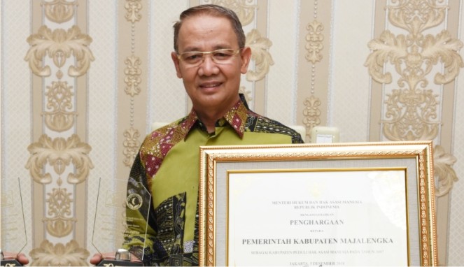MAJALENGKA, SC- Bupati Majalengka, DR H Karna SobahiMMPd kembali menerima penghargaan. Kali ini meraih penghargaan sebagai Kabupaten Peduli Hak Asasi Manusia (HAM) Tahun 2018. Penghargaan tersebut diberikan oleh Menteri Hukum dan Hak Asasi Manusia (Menkumham), Yasonna Laoly pada acara peringatan Hari HAM se-Dunia ke-70 dan penganugerahan Kabupaten Kota Peduli HAM dan Pelayanan Publik berbasis HAM di Kantor KemenkumhamRI, Selasa (11/12/2018).