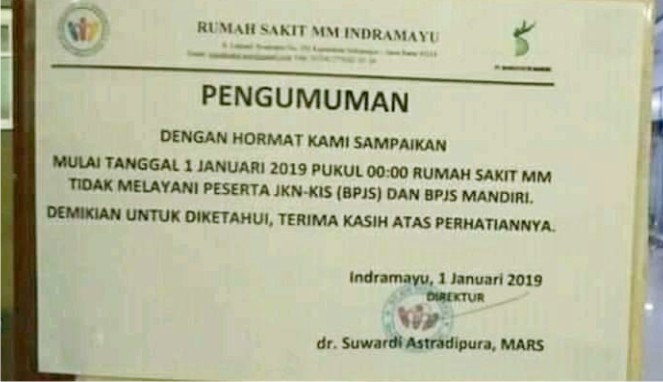 “Benar mas pengumuman di RS MM tidak melayani pasien peserta BPJS per Januari 2019,” ungkap Kabid Pelayanan Medis RS MM Indramayu saat diwawancarai Suara Cirebon di ruang kerjanya, Rabu (2/1).
