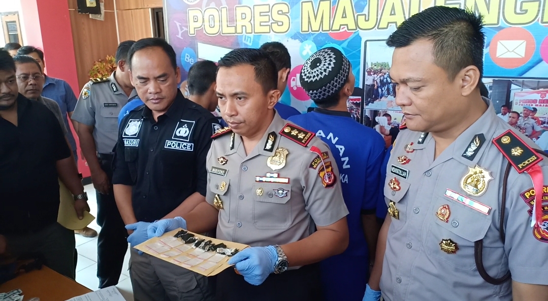 Kapolres Majalengka AKBP Mariyono,S.I.K.,M.Si didampingi Kasat Narkoba AKP Ahmad Nasori,S.H saat memberikan keterangan pers di Mapolres menjelaskan, Satuan Reskrim Narkoba Polres Majalengka selama bulan Juli telah berhasil mengungkap kasus yakni sebanyak 5 kasus terdiri dari kasus sabu 1 kasus, kasus peredaran OKT 4 kasus.