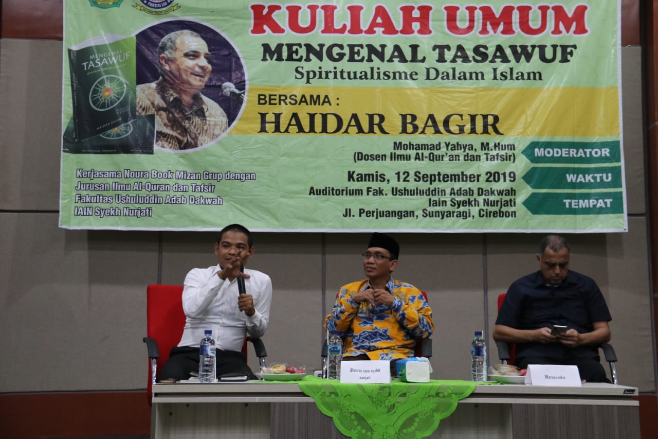 CIREBON, SC- Jurusan Ilmu Alquran dan Tafsir Fakultas Ushuludin Adab dan Dakwah (FUAD) Institut Agama Islam Negeri (IAIN) Syekh Nurjati Cirebon menyelenggarakan kegiatan kuliah umum mengenal tasawuf spiritualisme dalam islam bersama aktivis dan penulis buku tasawuf, Haidar Bagir di alua lantai 4 gedung fakultas setempat, Kamis (12/9/2019).