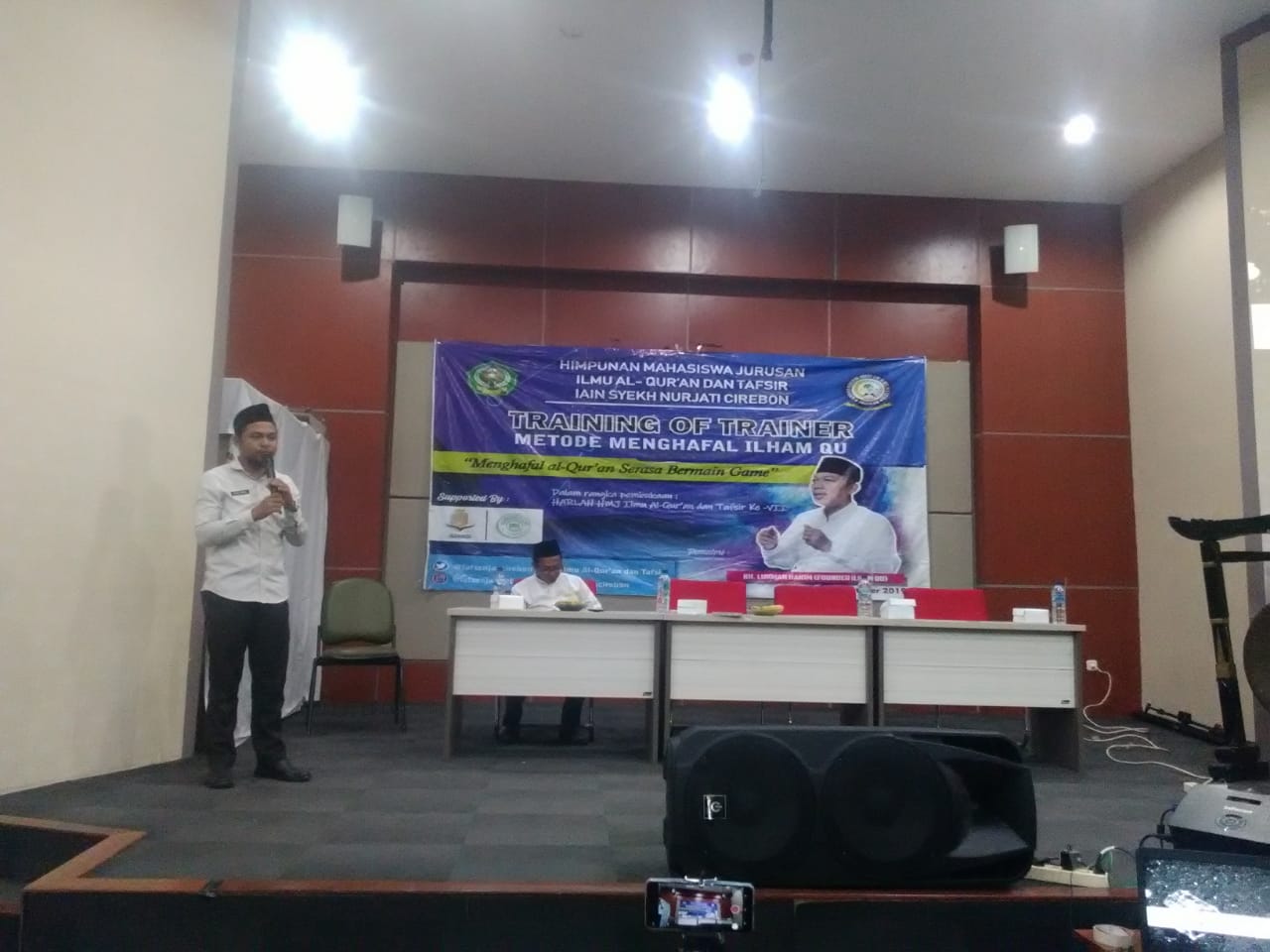 CIREBON, SC- Himpunan Mahasiswa Jurusan Ilmu Al-Qur’an dan Tafsir (HIMA IQTAF) Institut Agama Islam Negeri (IAIN) Syekh Nurjati Cirebon menggelar kegiatan Pelatihan Menghafal Alquran dengan Metode Bermain Game, di Gedung Auditorium Fakultas Ushuluddin Adab dan Dakwah (FUAD) kampus setempat, Senin (14/10).