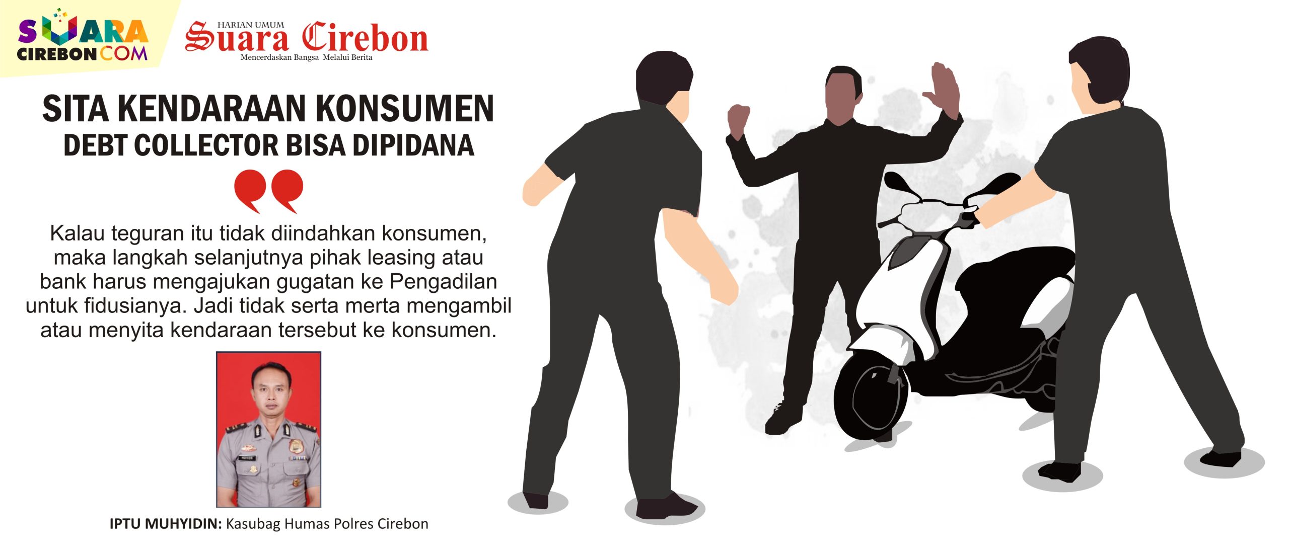 SUMBER, SC- Mengacu pada Peraturan Menteri Keuangan (PMK) nomor 130/ PMK 010 /2012 dan Peraturan Kapolri Nomor 8 tahun 2001, perampasan motor nasabah yang dilakukan oleh debt collector tidak dibenarkan. Jika debt collector mengambil motor nasabah secara paksa bisa memenuhi unsur-unsur pidana, bisa dikategorikan ke pelanggaran tindak pidana pasal 368.