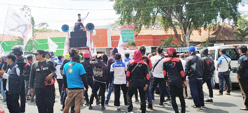 Aksi unjuk rasa yang dilakukan FSPMI, menolak hasil rapat pleno pengupahan dalam penetapan UMK Kabupaten Cirebon Tahun 2020, yang memutuskan naiknya UMK di Kabupaten Cirebon hanya 8,51 persen.