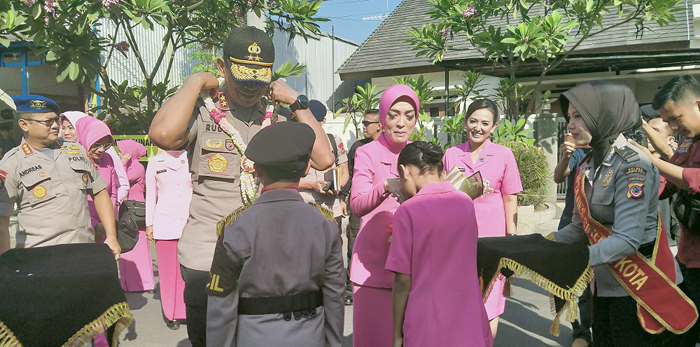 Rangkaian sambutanpun disambung dengan mengalungkan rangkaian bunga kepada Kapolda Jabar dan Ketua Bhayangkari dari Polisi Cilik (Pocil) dan Bhayangkari Cilik dengan diiringi tarian tradisional serta nyanyian yel yel penyambutan yang diikuti seluruh personil Polres Cirebon Kota.