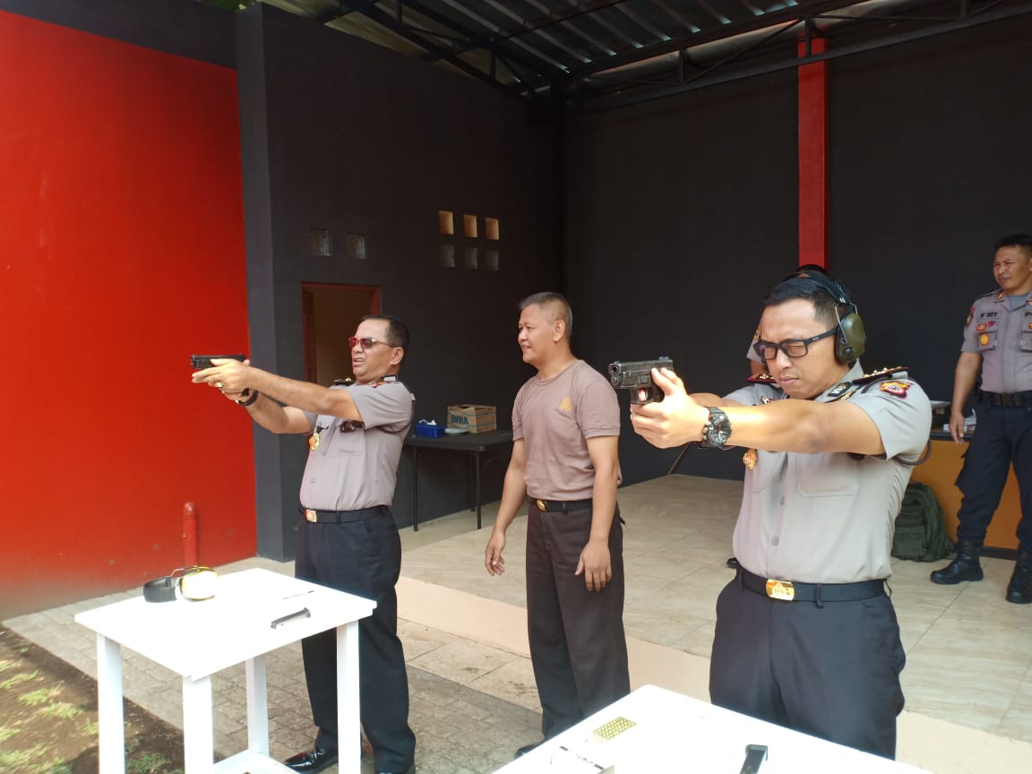 MAJALENGKA, SC- Kapolres Majalengka AKBP Mariyono melaksanakan latihan menembak bersama PJU Polres Majalengka di Lapangan Tembak Adhi Pradana Polres Majalengka, Selasa (10/12/2019).