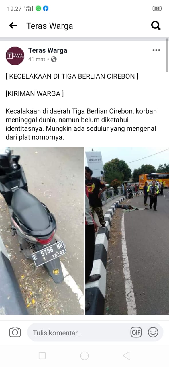 CIREBON, SC- Seorang pengendara sepeda motor Honda Beat yang belum diketahui identitasnya meninggal dunia setelah mengalami kecelakaan tunggal di pertigaan Jalan Ahmad Yani – Jalan Kalijaga, Kelurahan Pegambiran, Kecamatan Lemahwungkuk, Kota Cirebon, Sabtu (4/1/2020) pagi, sekitar pukul 05.30 wib. Diduga korban mengalami benturan keras hingga mengeluarkan darah segar dari bagian kepala.