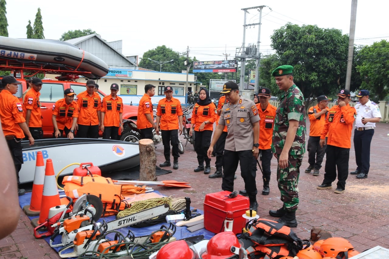 Dalam kesempatan itu juga Kapolres Majalengka beserta instansi terkait melakukan pemeriksaan peralatan dan perlengkapan yang diperlukan seperti perahu karet, pelampung, helm, dayung, gergaji mesin, tambang, sekop, senter, sepatu boots hingga kendaraan khusus seperti mobil pemadam kebakaran, ambulans, dan mobil BPBD. (Eka)