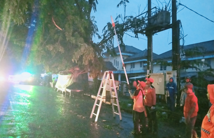 Menurutnya, akibat cuaca ekstrim beberapa hari ini telah menumbangkan pohon Angsana. Pohon tersebut menimpa kabel PLN yang berada di depan Pasar Kalitanjung.