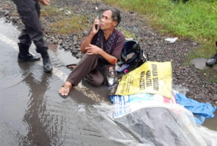 CIREBON, SC- Innalilahiwainalirojiun. Seorang suami pengendara sepeda motor yang berbocengan dengan istrinya mengalami kecelakaan lalulintas di jalan raya Cirebon-Bandung masuk wilayah Desa Babakan, Kecamatan Ciwaringin, Kabupaten Cirebon, Selasa (11/2/2020).