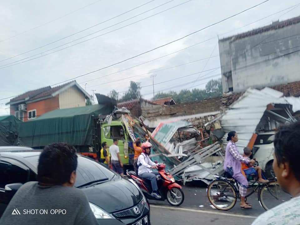 CIREBON, SC- Sebuah truk gandengan dengan nomor polisi F 9889 FD mengalami kecelakaan tunggal di Jalan Raya Sunan Gunungjati, Desa Astana, Kecamatan Gunungjati, Kabupaten Cirebon, Selasa (11/2/2020) dini hari sekitar pukul 04.00 WIB. Truk ini menabrak sebuah toko dan dua kendaraan minibus.