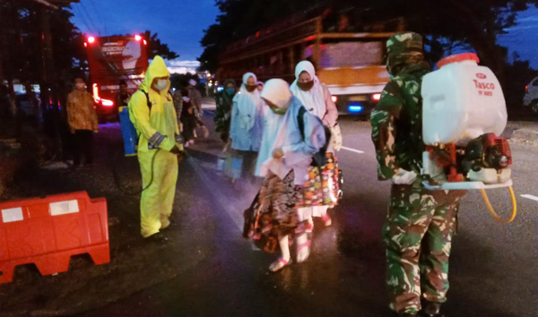 Meskipun telah dilakukan penyemprotan atas para santri saat akan meninggalkan Ponpes, namun, “Saat turun dari bus, para santri langsung disemprot cairan disinfektan,“ ungkapnya.