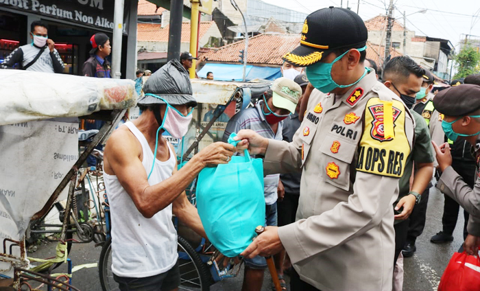 MAJALENGKA,SC- Kapolres Majalengka, AKBP. Dr. Bismo Teguh Prakoso didampingi Waka Polres Majalengka Kompol H. Hidayatullah dan PJU Polres Majalengka melakukan aksi kepedulian sosial dengan membagikan paket sembako kepada tukang becak yang terdampak wabah virus Corona atau Covid-19, selain juga membagikan masker bagi para pengguna jalan.
