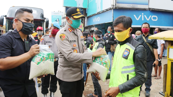 MAJALENGKA, SC- Kapolres Majalengka AKBP Dr. Bismo Teguh Prakoso didampingi Kapolsek Talaga AKP H. Agus Romy dan Para PJU Polres Majalengka kembali melakukan aksi kepedulian sosial dengan membagikan paket sembako dan masker kepada tukang ojeg dan tukang becak yang terdampak wabah Virus Corona atau Covid-19 di wilayah hukum Polsek Talaga. Aksi kepedulian sosial saat ini merupakan kali yang ke dua dilaksanakan di wilayah Kota Majalengka, Selasa (7/04/2020).