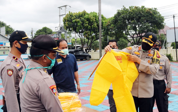 MAJALENGKA, SC- Kapolres Majalengka, AKBP Dr. Bismo Teguh Prakoso, menyerahkan bantuan baju Alat Pelindung Diri (APD) dan masker kepada Kabag Ops Polres Majalengka Kompol Manapin Pardede, S.H., kemarin.