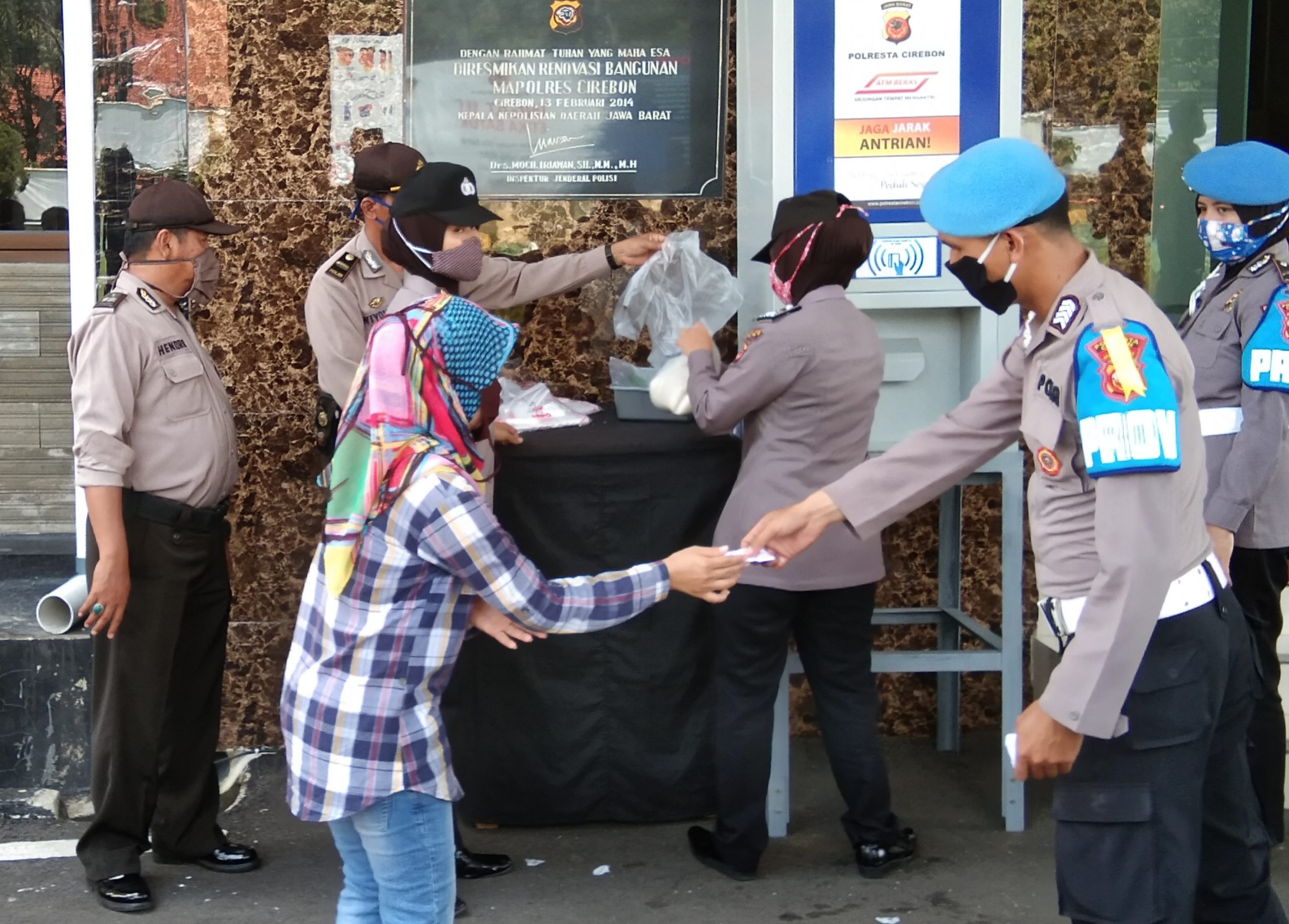 SUMBER, SC- Cara berbeda dilakukan Polresta Cirebon dalam memberikan bantuan kepada masyarakat di masa wabah Covid-19 ini. Bantuan berupa beras yang dibagikan tidak menggunakan tangan petugas, melainkan menggunakan mesin ATM beras. Masyarakat yang menerima bantuan cukup menempelkan kartu yang sudah dibagikan, kemudian secara otomatis beras akan keluar.