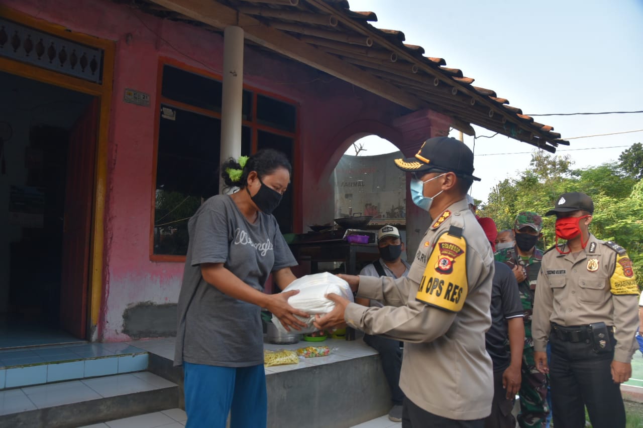 Kapolresta Cirebon, Kombes Pol M Syahduddi SIK MSi bersama Dandim 0620 Kabupaten Cirebon, Letkol ARH Adhi Kurniawan SE MHan, Camat Sumber, Kapolsek Sumber secara simbolis menyerahkan bantuan sembako itu di sejumlah warga Kelurahan Watubelah, Kecamatan Sumber, Kabupaten Cirebon.