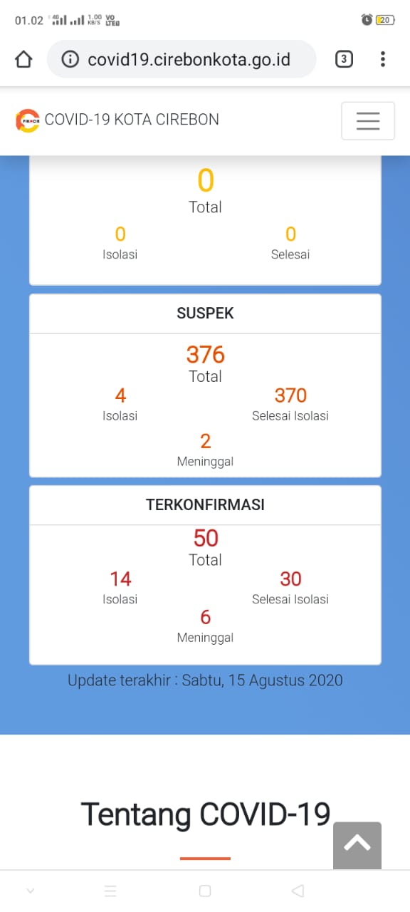 Menurut data yang dilansir dari website resmi Pusat Informasi dan Koordinasi Covid-19 Kota Cirebon (Pikocir), 50 orang terkonfirmasi positif Covid-19, 14 di antaranya masih 14 isolasi, 6 meninggal dunia, dan sisanya selesai isolasi. (M Surya)