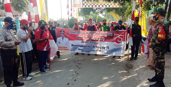 KABUPATEN CIREBON, SC- Dalam rangka HUT RI ke 75, Pemerintah Desa Sarabau, Kecamatan Plered, Kabupaten Cirebon melaksanakan Mlaku Bareng bersama warga setempat, Minggu (23/8/2020).