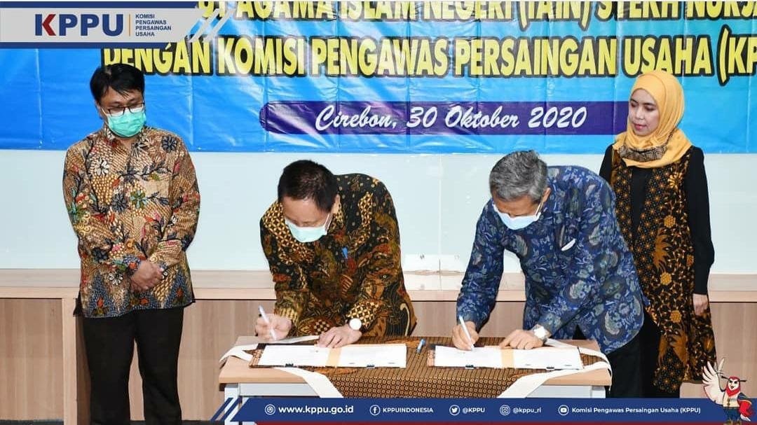 CIREBON, SC- Institut Agama Islam Negeri (IAIN) Syekh Nurjati Cirebon menandatangani kerjasama dengan Komisi Pengawas Persaingan Usaha (KPPU) di gedung Fakultas Ilmu Tarbiyah dan Keguruan (FITK) lantai 5 kampus setempat, Jum’at (30/10/2020).