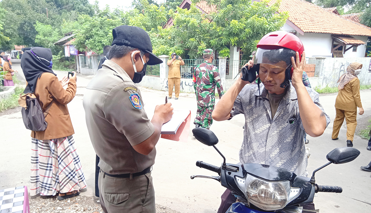 KABUPATEN CIREBON, SC- Tak kenal lelah, pantang kendor, Satuan Tugas ( Satgas ) Penanganan Covid-19 Kecamatan Weru dan Pemerintah Desa Megu Gede menggencarkan pentingnya disiplin memakai masker jntuk mencegah penularan Covid-19 lewat kegiatan Penegakan Hukum (Gakum) dan pendisiplinan penerapan protokol kesehatan di Jalan Blok Babakan, Desa Megu Gede melakukan razia masker kepada para pengendara yang lewat di kawasan tersebut, Senin (2/11/2020).