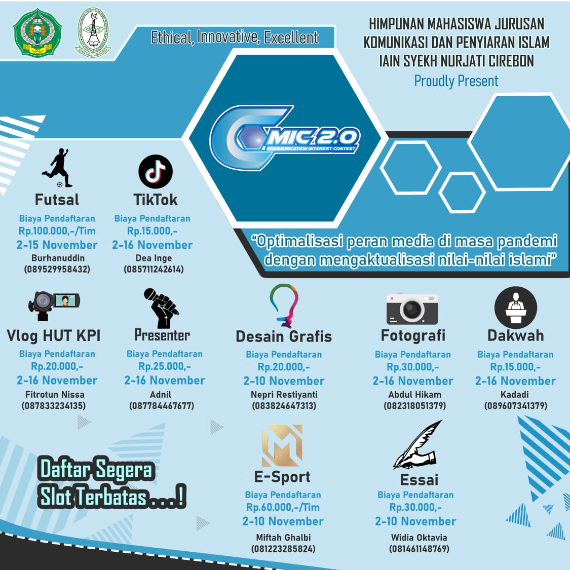Pada tahun ini HMJ KPI melangsungkan kembali acara COMIC (Communication Interest Contest) jilid 2 dengan mengusung tema “Optimalisasi Peran Media di Masa Pandemi dengan Mengaktualisasi Nilai-nilai Islami”.