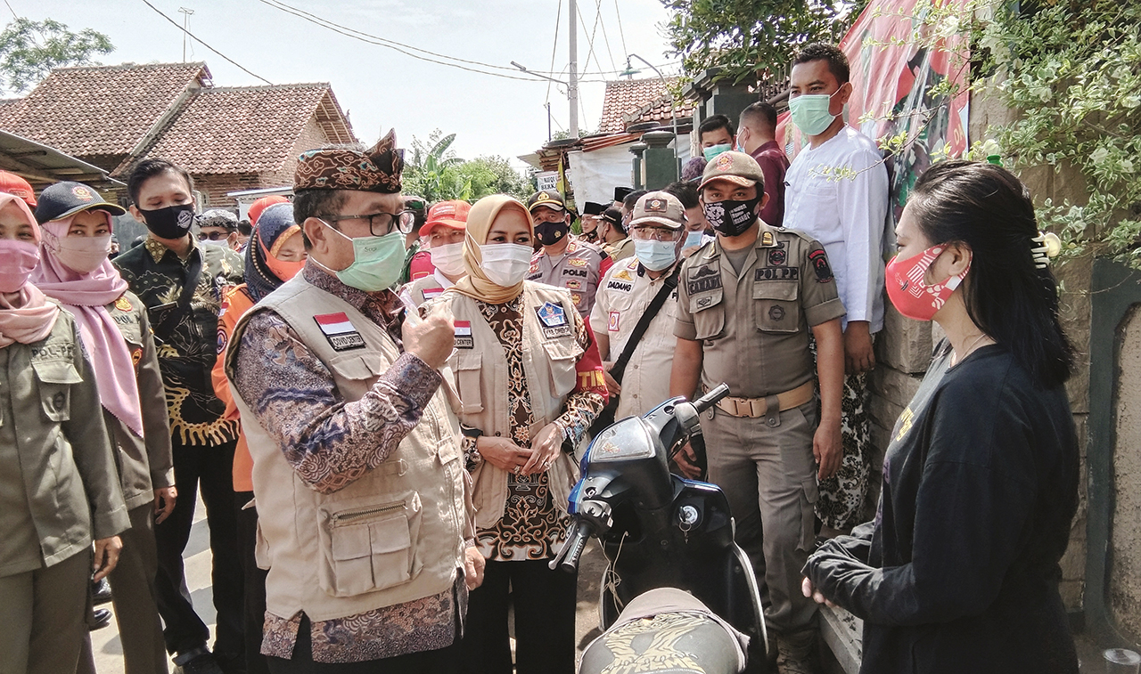 KABUPATEN CIREBON, SC- Bupati Cirebon, H Imron bersama Forum Komunikasi Pimpinan Daerah (Forkopimda) Kabupaten Cirebon melakukan monitoring penerapan disiplin dan penegakan hukum protokol kesehatan yang dilakukan Satuan Tugas (Satgas) Penanganan Covid-19 Tingkat Kecamatan di Desa Krandon, Kecamatan Talun, Kamis (5/11/2020).