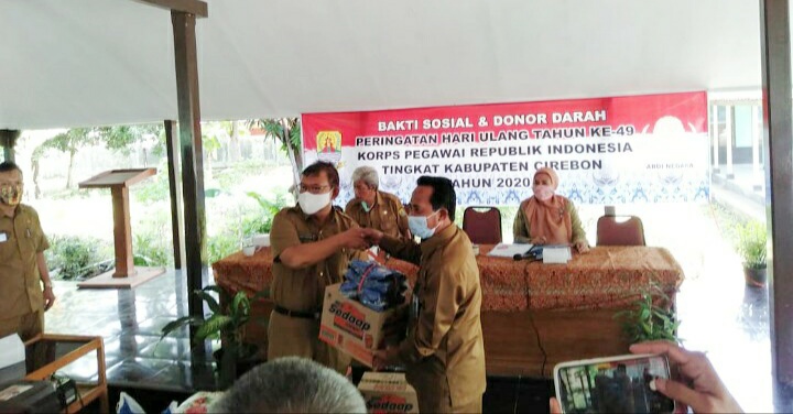 LEMAHABANG, SC- Rangkaian kegiatan HUT ke-49 Korp Pegawai Republik Indonesia (Korpri) tingkat Kabupaten Cirebon digelar di Kantor Kecamatan Lemahabang, Selasa (24/11/2020). Kegiatan tersebut, diisi dengan Bakti Sosial (Baksos) pembagian sembako untuk masyarakat yang membutuhkan dan donor darah.
