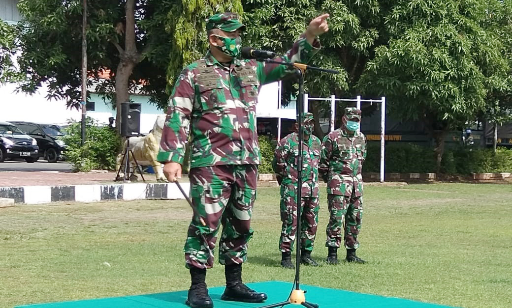 KOTA CIREBON, SC- Dengan tetap melaksanakan protokol kesehatan (Prokes), Danrem 063/SGJ Cirebon, Kolonel Inf. Elkines Villando Dewangga, K.S.A.P memimpin Apel Pasukan yang siap untuk melaksanakan Patroli dalam rangka penegakan disiplin Prokes Covid 19 di wilayah Cirebon, Rabu (25/11/2020).