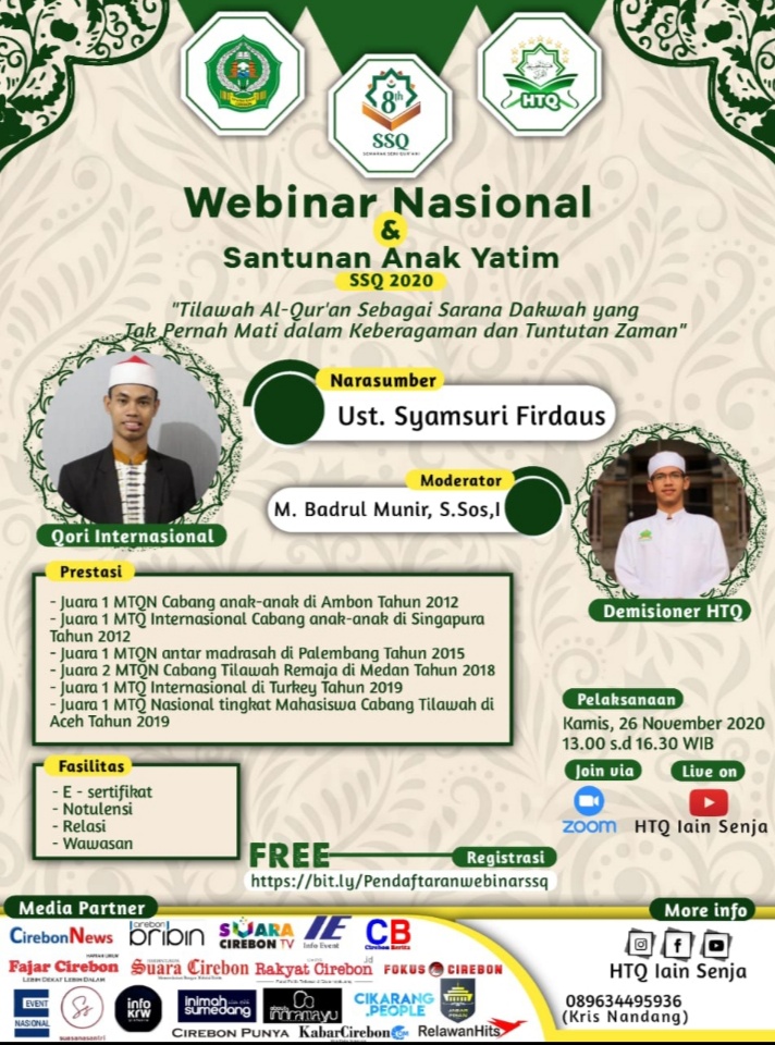 CIREBON, SC- Unit Kerja Mahasiswa (UKM) Hay’atu Tahfidzil Qur’an (HTQ) Institut Agama Islam Negeri (IAIN) Syekh Nurjati Cirebon menyelenggarakan Semarak Seni Qur’ani (SSQ) secara virtual, Kamis dan Ahad (26,28/11/2020).
