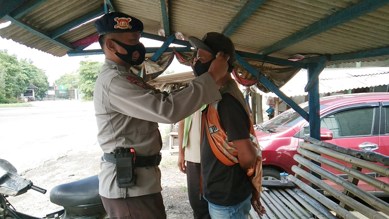 KABUPATEN CIREBON, SC- Berlokasi di persawahan Desa Bringin, Kecamatan Ciwaringin, Kabupaten Cirebon, Bhayangkara Kepala (Bharaka) Wisnu Anggota Brimob Kompi 4 Batalyon C Pelopor Satbrimob Polda Jabar membagikan masker kepada masyarakat desa yang sedang duduk-duduk guna mencegah penyebaran Covid-19, Senin (18/01/2021).