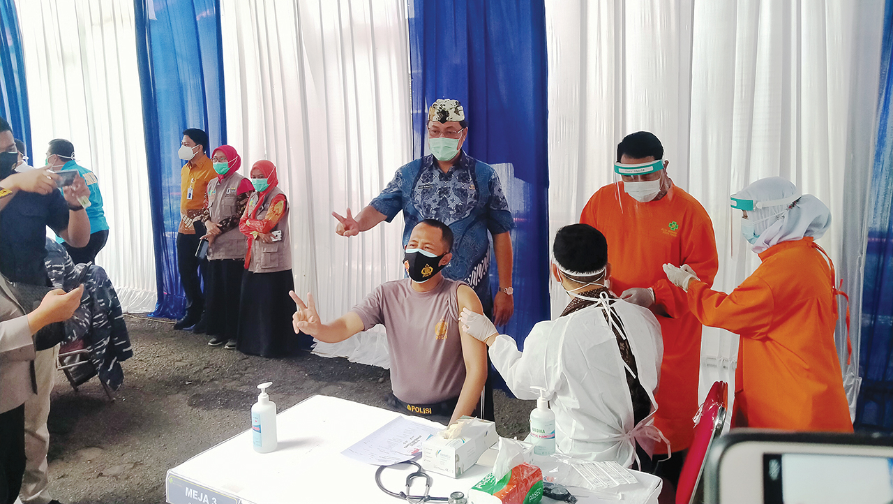 KOTA CIREBON, SC – Kapolres Cirebon Kota (Ciko), AKBP Imron Ermawan menjadi salah satu unsur Forkopimda pertama yang disuntik vaksin Covid-19 buatan Sinovac bersama para tenaga kesehatan (nakes) dan tokoh masyarakat di Kota Cirebon, Jumat (29/1/2021). Usai menjalani vaksinasi yang dilaksanakan di halaman depan Rumah Sakit Daerah (RSD), Gunung Jati Kota Cirebon tersebut, Kapolres menuturkan tidak ada reaksi apapun.