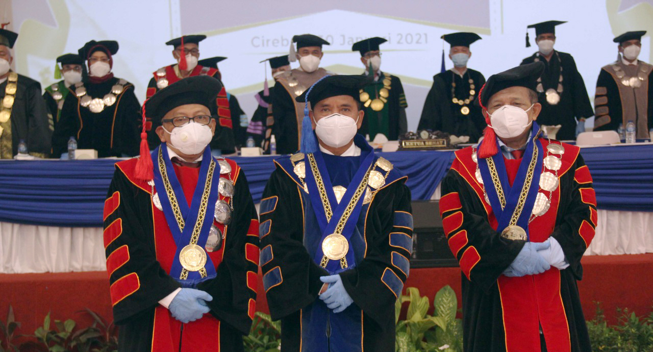 KOTA CIREBON, SC- Di usia yang ke-60 tahun Universitas Swadaya Gunung Jati (UGJ) Cirebon kembali mengukir sejarah. Sebanyak tiga orang dosen dikukuhkan Majelis Guru Besar/Profesor kampus setempat di Auditorium Kampus Utama UGJ Jalan Pemuda Kota Cirebon, Sabtu (30/1/2021). Adapun ketiga profesor yang dikukuhkan tersebut adalah Prof. Dr. Drs. H. Mukarto Siswoyo, M.Si., Prof. Dr. H Junaedi, S.H., M.H, dan Prof Dr. H. Endang Sutrisno, M.Hum.