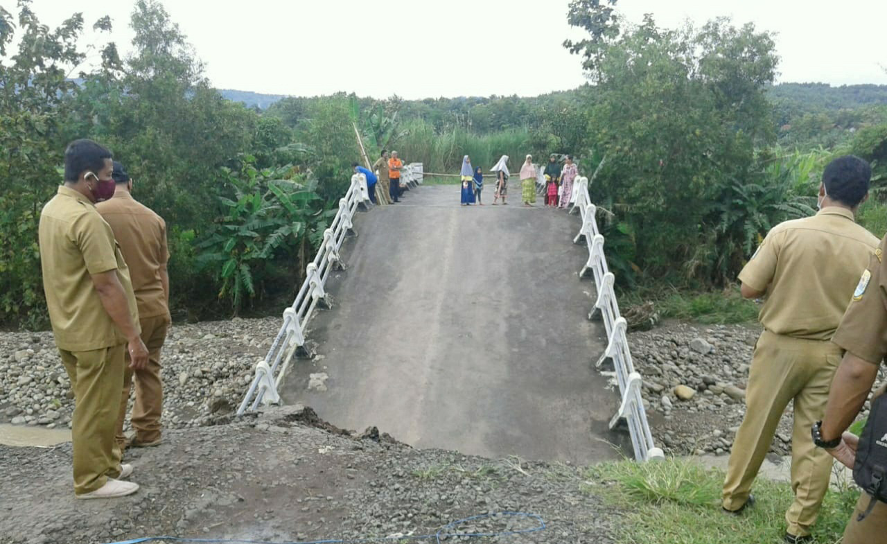 “Kami sudah antisipasi untuk pembuatan jembatan darurat. Tapi bukan jembatan gantung. Kita siapkan mulai hari ini (kemarin, red). Panjangnya sesuai jembatan semula yaitu 30 meter, hanya lebarnya saja dari 4 meter kita buat 1,5 meter saja,” kata Iwan, Selasa (2/2/2021).