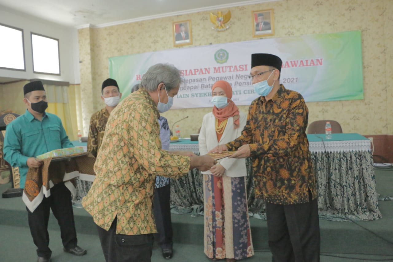 CIREBON, SC- Rektor Institut Agama Islam Negeri (IAIN) Syekh Nurjati Cirebon, Dr H Sumanta Hasyim MAg melepas 4 pegawai yang terdiri dari tenaga pendidik dan kependidikan di kampus setempat, Jumat (5/3/2021).