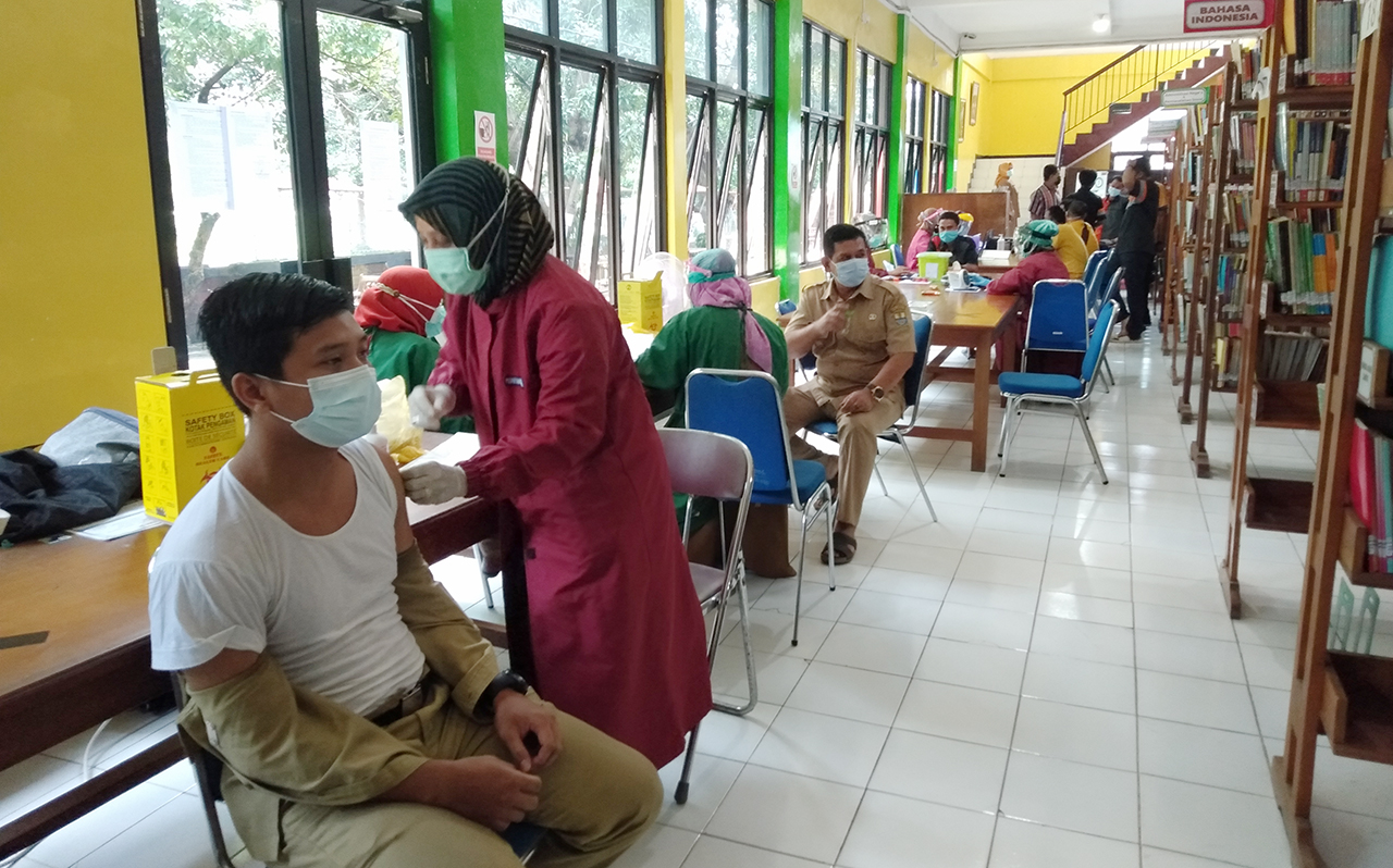 KOTA CIREBON, SC- Sebanyak 80 pegawai ASN dan non-ASN Dinas Perpustakaan dan Kearsipan (Dispusip) Kota Cirebon menerima vaksinasi serentak di Perpustakaan 400 Kota Cirebon Jalan Brigjen Darsono, Sunyaragi, Kecamatan Kesambi, Kota Cirebon, Senin (8/3/2021).
