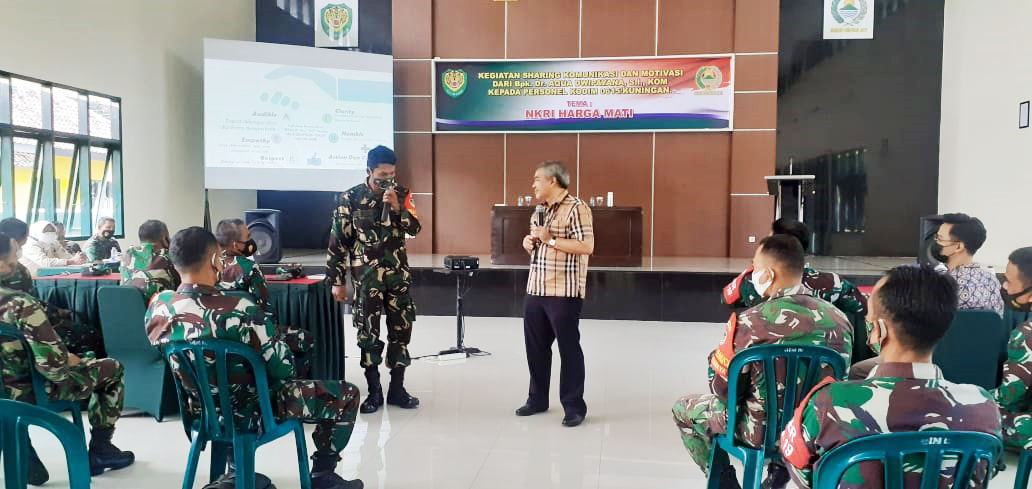 KUNINGAN, SC- Babinsa jajaran Kodim 0615 Kuningan mengikuti kegiatan Sharing Komunikasi dan Motivasi dengan tema “NKRI Harga Mati” di aula Makodim setempat, Selasa (9/3/2021). Sharing Komunikasi dan Motivasi ini merupakan program dari Pangdam III/Siliwangi, sebagai pemateri dalam kegiatan ini adalah Aqua Dwipayana.