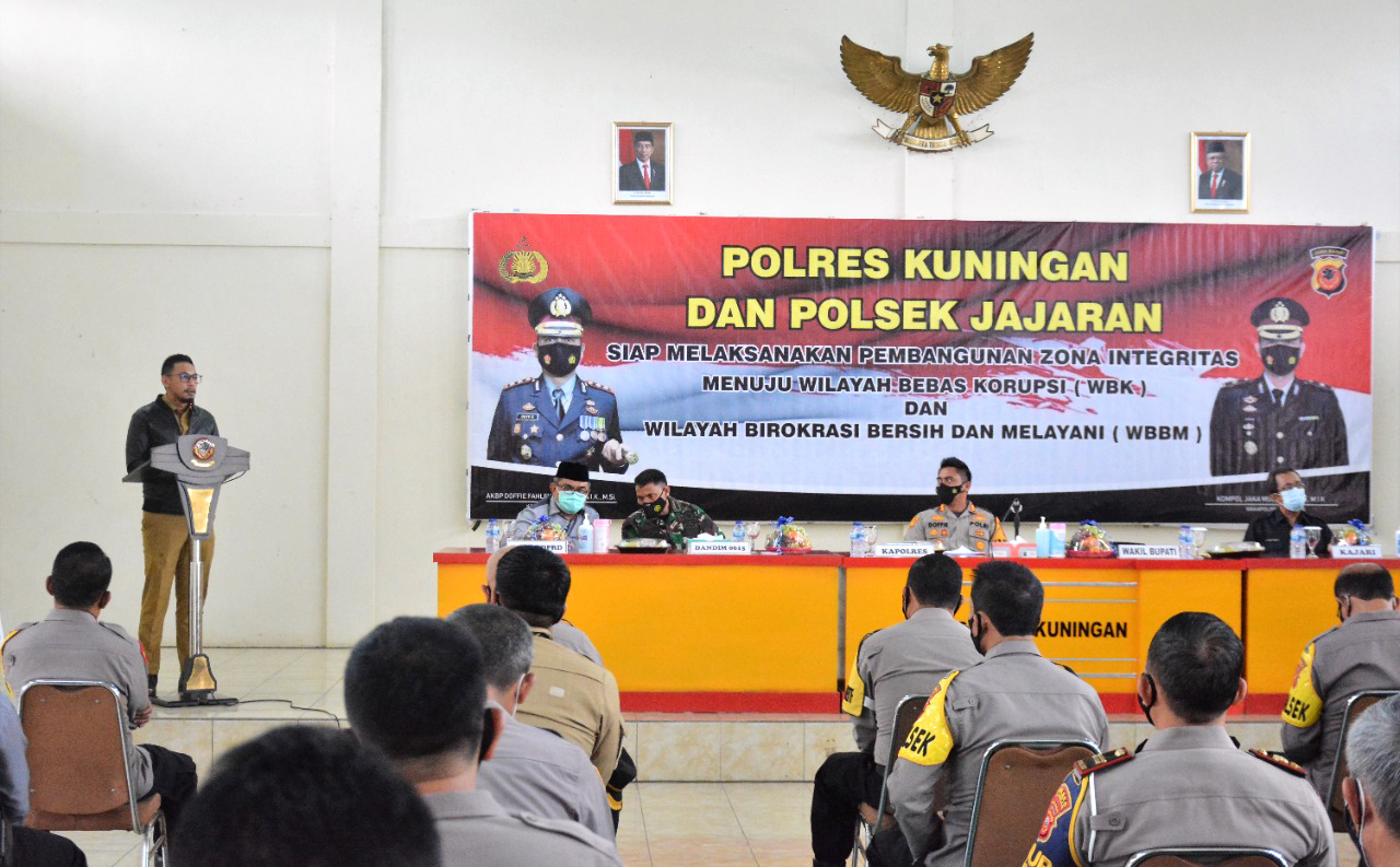 Wabup juga mengajak semua pihak untuk memberikan dukungan serta bersinergi dalam mewujudkan pembangunan zona integritas menuju Wilayah Bebas dari Korupsi dan Wilayah Birokrasi Bersih Melayani di Kabupaten Kuningan khususnya di lingkungan Polres Kuningan.