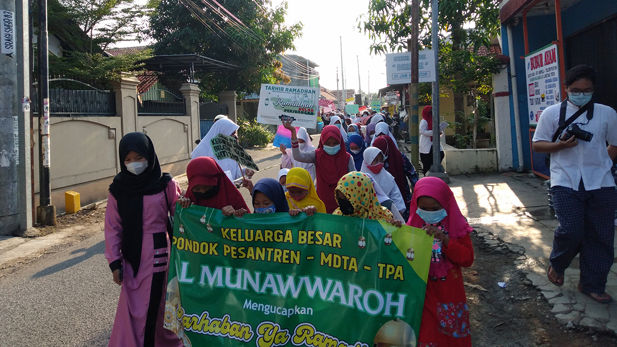 KOTA CIREBON, SC- Puluhan santri Madrasah Diniyah Takmiliyah Awaliyyah (MDTA) Al-Munawwaroh Kota Cirebon menyambut bulan suci Ramadhan dengan melakukan pawai, Senin (12/4/2021).