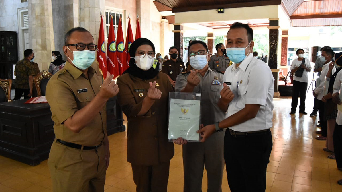 INDRAMAYU, SC- Bupati Indramayu, Hj. Nina Agustina menyampaikan, sertifikat hak atas tanah menjadi bukti terkuat kepemilikan tanah. Dengan memiliki sertifikat tanah, selain meminimalisir konflik, juga memberikan kepastian hukum bagi pemiliknya. Hal itu disampaikan Bupati Nina saat penyerahan ratusan sertifikat tanah pada acara Program Pendaftaran Tanah Sistematis Lengkap (PTSL) di Pendopo Indramayu, Selasa (13/04/2021).