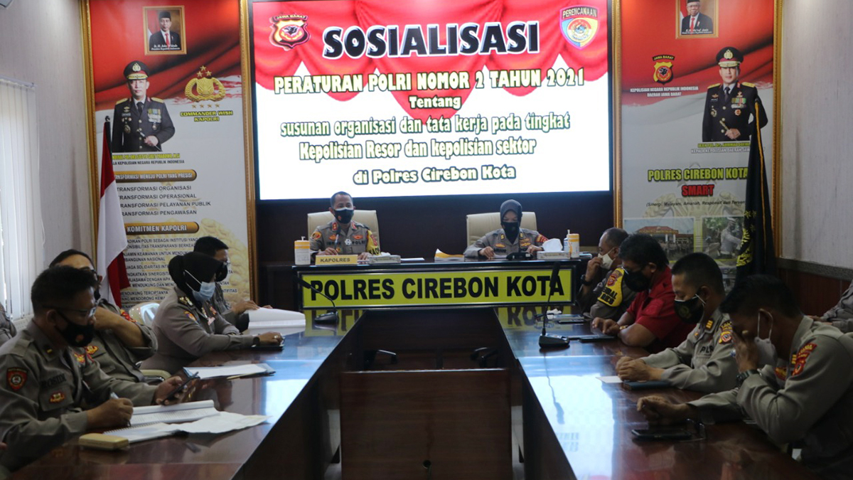 KOTA CIREBON, SC– Polres Cirebon Kota menyosialisasikan Peraturan Polisi (Perpol) No. 2 tahun 2021 tentang Susunan Organisasi dan Tata Kerja pada tingkat Kepolisian Resor (Polres) dan Kepolisian Sektor (Polsek) bertempat di aula Polres setempat, Kamis (15/4/2021).
