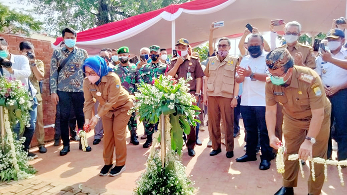 WAKIL Wali Kota Cirebon Eti Herawati sedang memotong pita saat soft launching alun-alun Kejaksan Senin (12/4) pekan lalu. (Foto: Surya/Dokumen/Suara Cirebon)