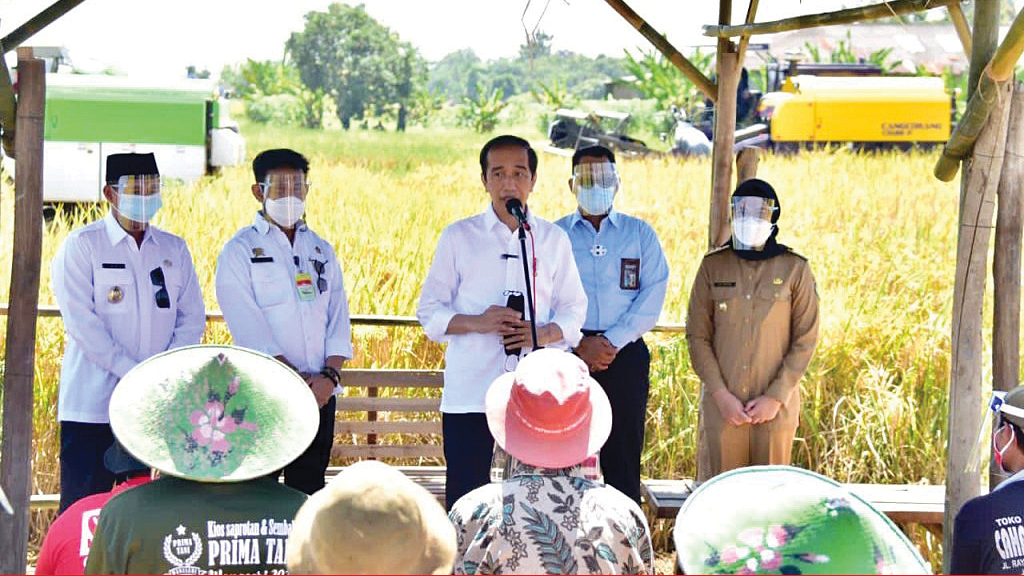 “Pagi hari ini (kemarin, red) saya berada di Desa Wanasari, Kabupaten Indramayu, Provinsi Jawa Barat, untuk melihat secara langsung panen yang dilakukan di sini,” kata Presiden, saat menyampaikan keterangan pers di lokasi panen, Rabu (21/4/2021).