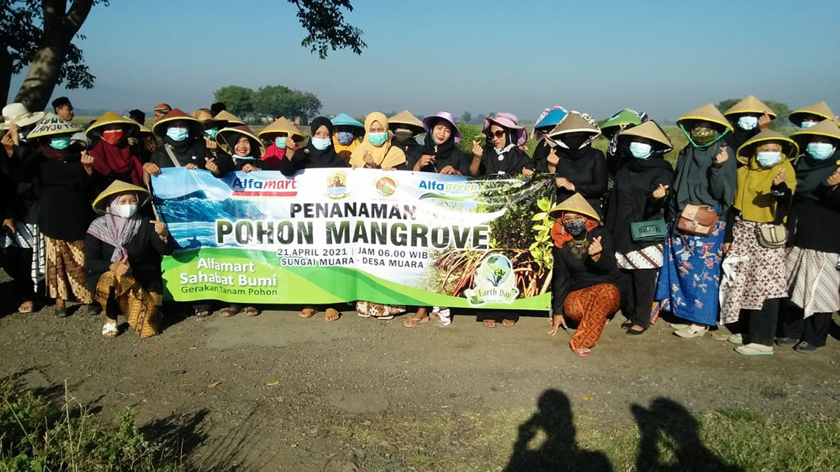 KABUPATEN CIREBON, SC- PT Sumber Alfaria Trijaya (Alfamart) mengandeng Muspika Suranenggala, Pemerintah Desa Muara, kader PKK Kecamatan Suranenggala dan Komunitas Masyarakat Peduli Lingkungan Sungai (MPLS) melakukan penanaman mangrove di Sungai Muara, Desa Muara, Kecamatan Suranenggala, Kabupaten Cirebon, Rabu (21/4/2021).