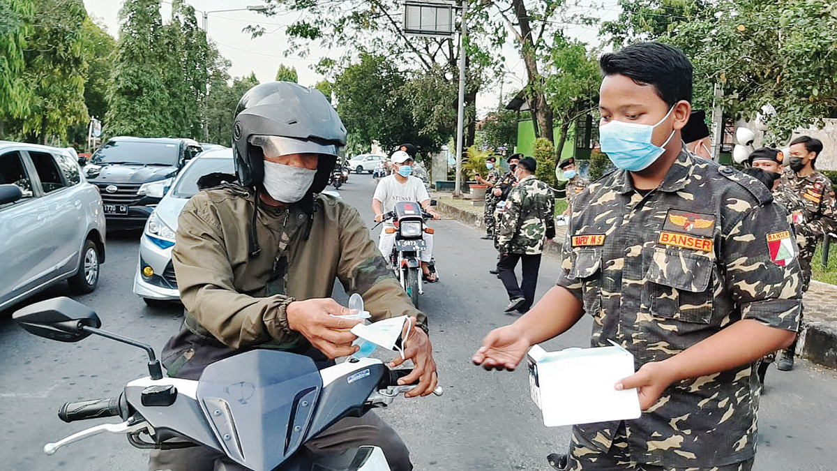 KABUPATEN CIREBON, SC- Jajaran pengurus Gerakan Pemuda (GP) Ansor Kabupaten Cirebon membagikan masker dan takjil kepada masyarakat yang sedang melintas di sekitar lokasi acara peringatan hari lahir (Harlah) ke-87 GP Ansor di NU Centre Kabupaten Cirebon, Sabtu (1/5/2021).