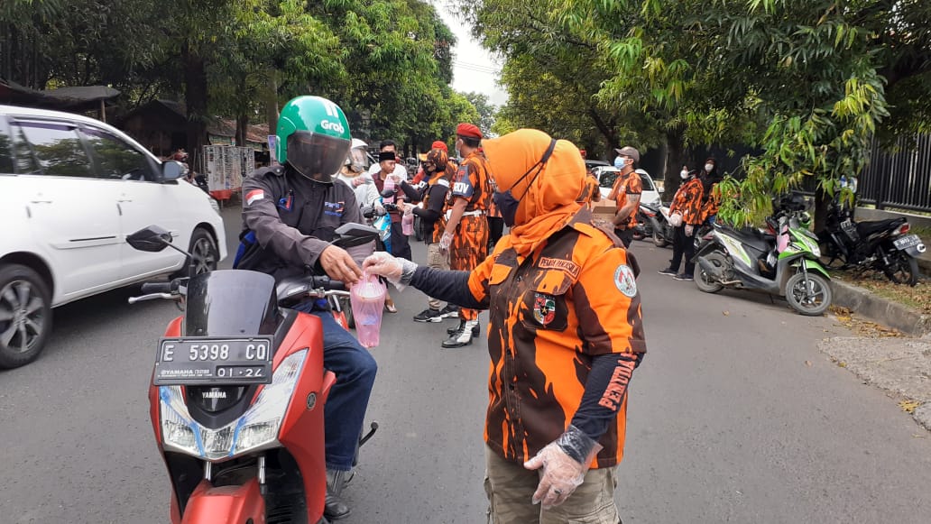KABUPATEN CIREBON, SC- Majelis Pimpinan Cabang (MPC) Pemuda Pancasila (PP) Kabupaten Cirebon membagikan ribuan takjil secara gratis kepada masyarakat yang melintas di sekitar Sarana Olahraga (SOR) Watubelah, Kecamatan Sumber, Jumat (7/5/2021).