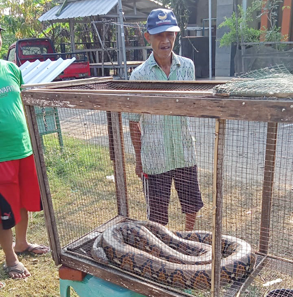 KABUPATEN CIREBON, SC- Warga Blok Krajan RT 016/006, Desa Sambeng, Kecamatan GunungJati, Kabupaten Cirebon menemukan ular sanca yang memiliki panjang sekitar 3,5 meter. Ular tersebut berhasil ditangkap dan ditempatkan dalam sebuah kandang kawat ram sehingga menjadi tontonan warga.