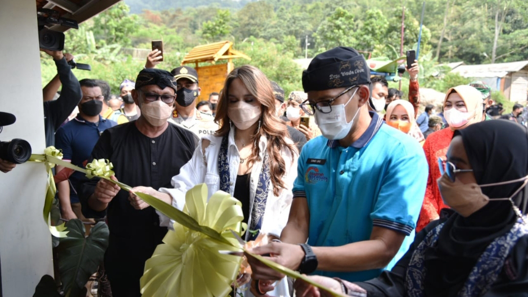 Kehadiran Menparekraf yang didampingi artis cantik Cinta Laura dalam rangka Sosialisasi Anugerah Desa Wisata Indonesia 2021, bertempat di Desa Wisata Cibuntu, Kecamatan Pasawahan.